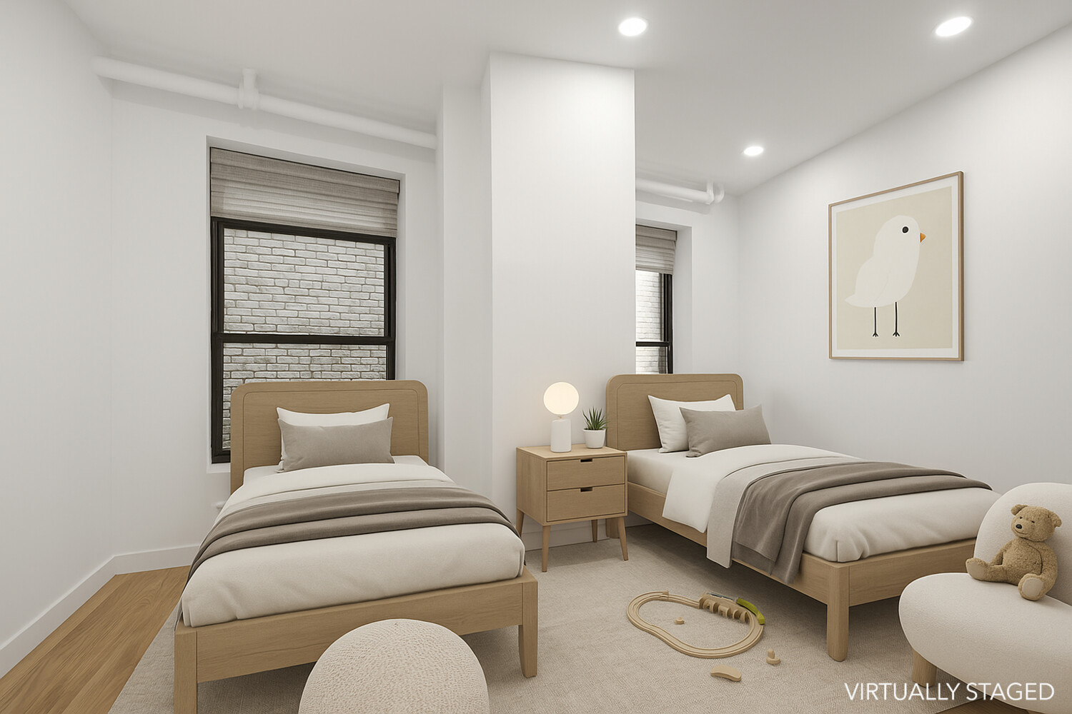 The primary suite features a walk-in closet and a luxurious en-suite bath, while the second bedroom's generous proportions allow for flexible layouts, including the option to accommodate two beds. A third bedroom functions equally well as a home office or guest bedroom.