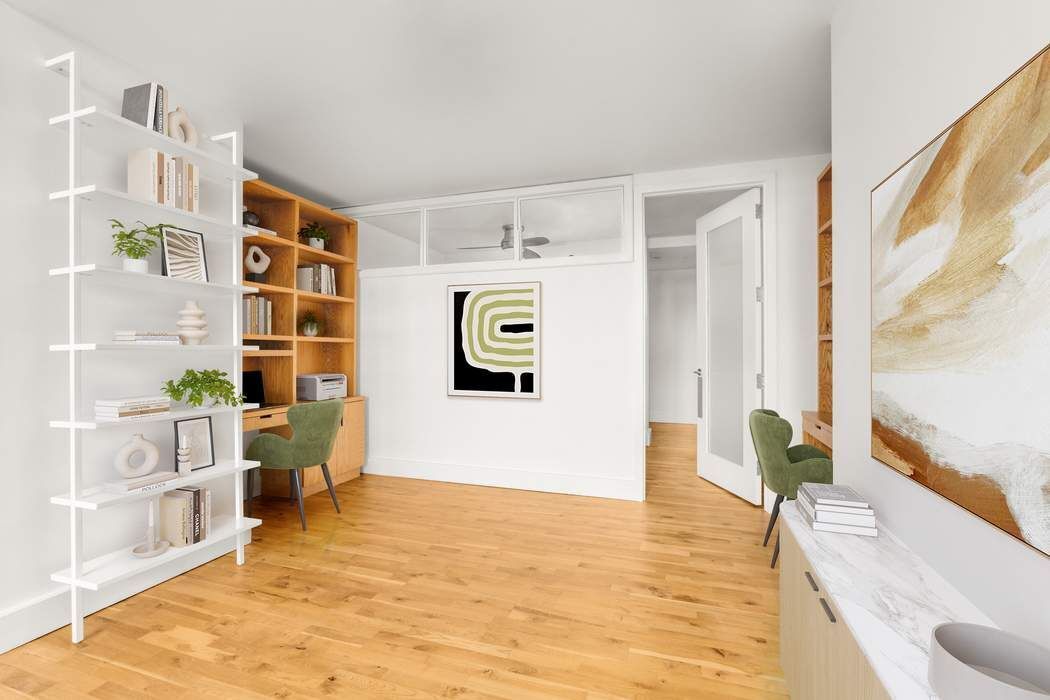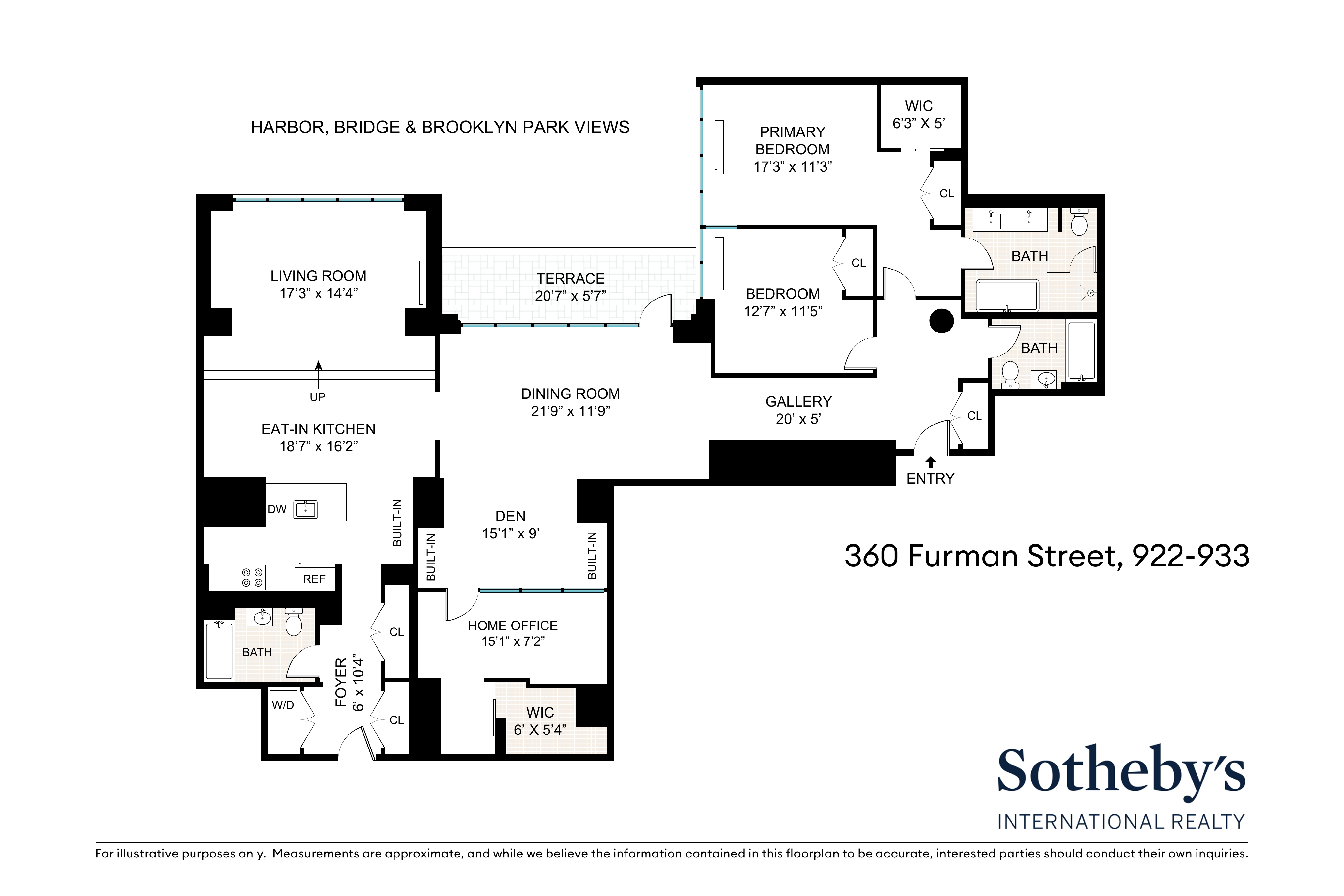 Expansive Brooklyn Bridge Park Loft – 2BR/3BA with Full-Size Bonus Room for Guest Space, Nursery or Office Space, Plus Private Terrace & Skyline Views! Welcome to a thoughtfully combined home located at One Brooklyn Bridge Park in Brooklyn Heights, offering approximately 2,281+/- square feet of meticulously designed interior space, along with 115 square feet of private terrace. Currently configured as a two bedroom plus a home office with three full bathrooms, this expansive loft blends luxury, functionality, and iconic views. Available for immediate occupancy. The generously sized apartment allows for complete customization and versatility of its bright, airy, and elegant living and dining spaces. Dramatic soaring 13-foot ceilings and oversized windows flood the home with natural light and frame breathtaking northern views of Brooklyn Bridge Park, Brooklyn Bridge, the New York Harbor, and the Manhattan skyline. This home offers the perfect setting to unwind and entertain guests. At the heart of the home is a recently refinished open chef’s kitchen, a quartz island, high-end appliances including a SubZero refrigerator and Bosch cooktop and oven, and a custom built-in pantry offering abundant storage. Located in its own private wing is the primary en-suite bedroom, with oversized citi-quiet windows and a generously sized custom fitted walk-in closet. The spa-like en-suite bathroom features a freestanding soaking tub, glass-enclosed shower, dual vanity, and elegant terrazzo-tiled walls. The spacious second bedroom offers a custom-fitted closet, citi-quiet windows, and easy access to a full bathroom directly across the way. Two discrete home office areas are smartly outfitted with custom built-ins, offering ideal work-from-home flexibility. A versatile bonus room—currently styled as a nursery—adds to the home’s versatility and features ample storage. Additional highlights of this exceptional Brooklyn Heights loft include solid oak flooring, soaring 13-foot ceilings, an abundance of storage, brand new large capacity washer/dryer, and bespoke custom built-ins throughout. One Brooklyn Bridge Park is a luxury full-service condo in picturesque Brooklyn Heights originally built in 1928 and formerly a printing factory before being converted in 2007. The abundance of amenities includes 24/7 doorman/concierge service, a state-of-the-art 3,000-square-foot fitness center, a Peloton bike room, two cardio rooms, a billiards room, several children’s play and art rooms, a movie screening room, a music room with a baby grand piano, yoga rooms, a virtual golf simulator, cold storage, an on-site attended parking garage, two conference rooms, two lending libraries, and two landscaped courtyards. Located in the fabulous waterfront Brooklyn Bridge Park, OBBP residents have easy access to incredible recreational space, including dog runs, playgrounds, trails, picnic areas, lawns, soccer fields, basketball courts, pickleball, volleyball, handball, roller skating, kayaking, and sailing via the ONE°15 Brooklyn Marina. OBBP is also conveniently located minutes from many modes of public transportation, including the NYC Ferry, and offers easy access to a for-fee garage for car and bike parking. *Represents current apartment configuration, which may not conform to official legal documentation. Tenants should consult with their legal or architectural professionals to determine legal use parameters.
