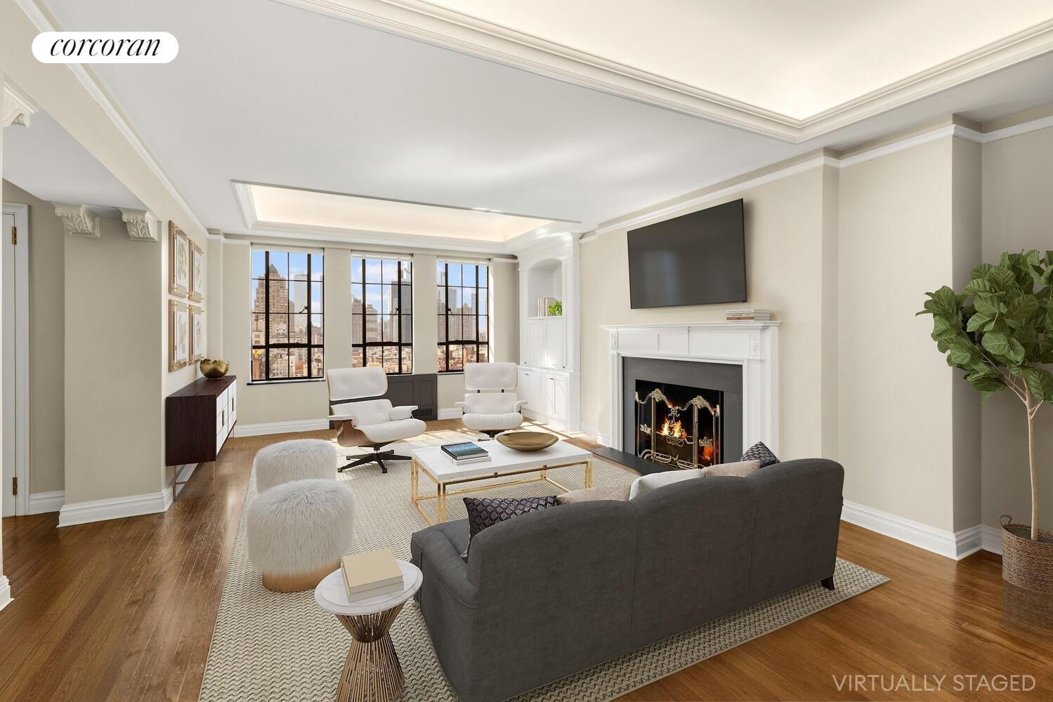 A jewel box in the sky! Welcome to 340 West 57th Street, Apartment 16J, a stunning, spacious one-bedroom, one-bathroom prewar condo residence with high cove ceilings throughout and spectacular unobstructed south-facing city and skyline views. Located on coveted West 57th Street right by Columbus Circle, this sunlit home with a working wood burning fireplace and washer dryer offers a harmonious blend of prewar charm and modern luxury.