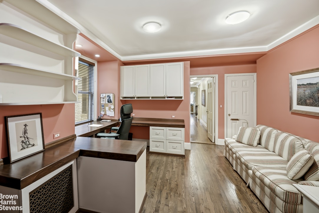 The upper level includes a spacious primary suite with a wood-burning fireplace, ensuite bath, and ample closet space. Two additional bedrooms (one currently functioning as a large home office) share a well-proportioned hall bath. A sitting room--accessible both from the hallway and through the primary suite--serves as a flexible fourth bedroom, den, or home office. A staff room with washer/dryer and elevator access completes the second floor.