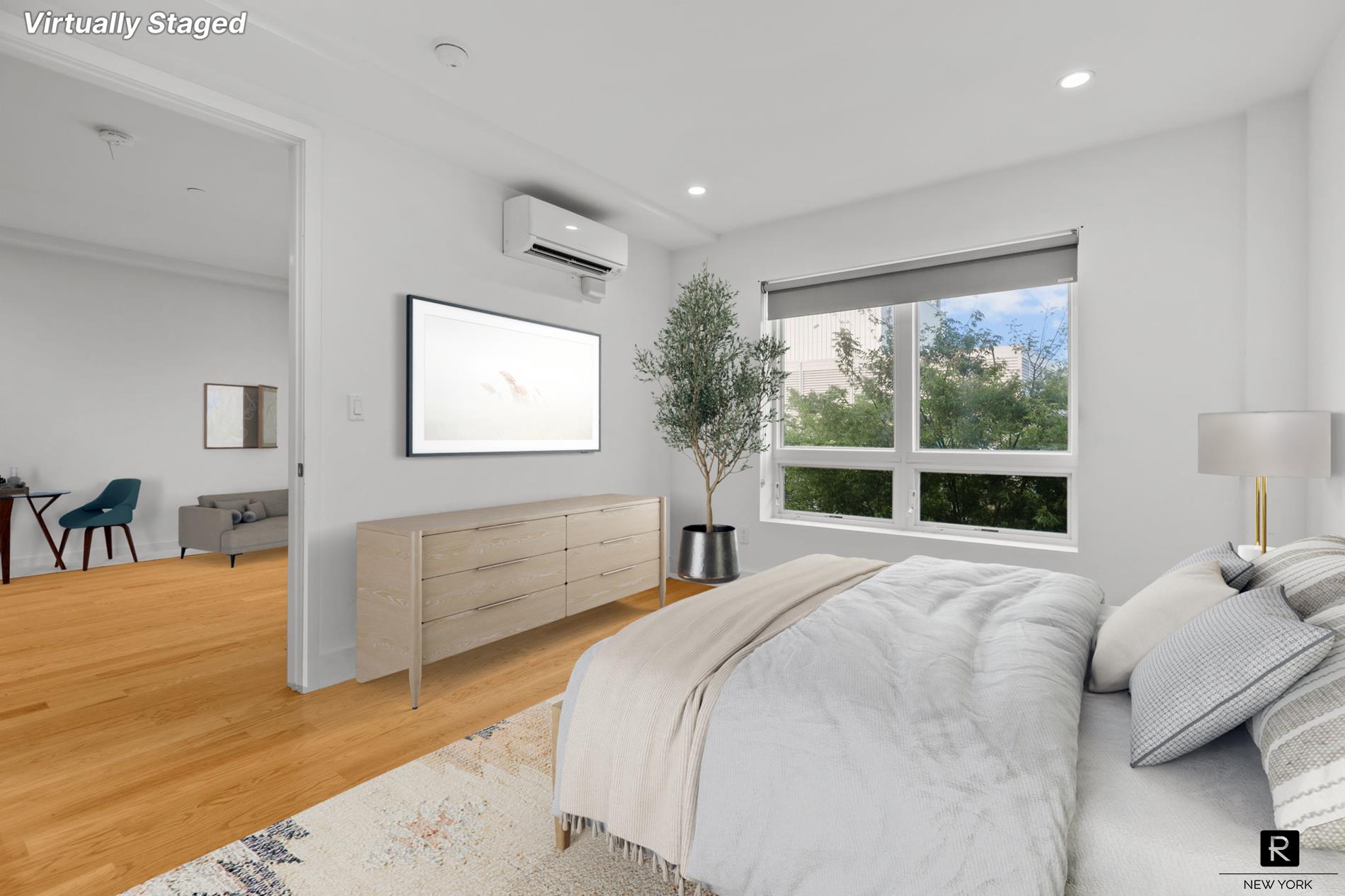 The ideal layout of this spacious open-plan condo blends modern comfort with timeless style - High ceilings, oversized windows, a Juliette balcony, hardwood floors, recessed lighting, central HVAC (heating & cooling), a comfortable bathroom, and a convenient entry foyer with a hall closet.