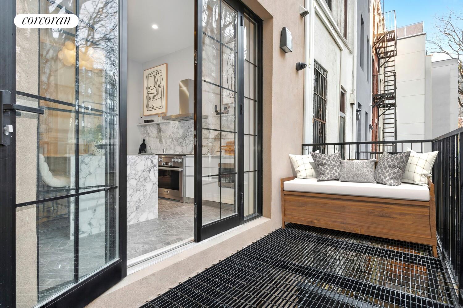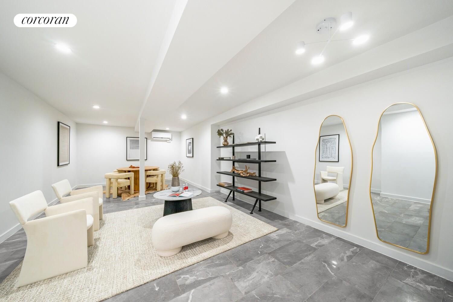 Masterfully renovated to perfection, the parlor floor boasts an impressive 11'4" ceiling heights, a beautiful white oak herringbone wood flooring as well as a powder room appointed with a marble vanity, faucet with brass finish and black marble wall & flooring. Entertain with style in this meticulously designed living and dining spaces, this home presents a seamless blend of sophistication and warmth.
