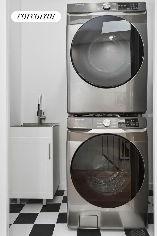 This top floor is completed with a separate laundry room and outfitted with a full-size stackable Samsung Washer/Dryer.