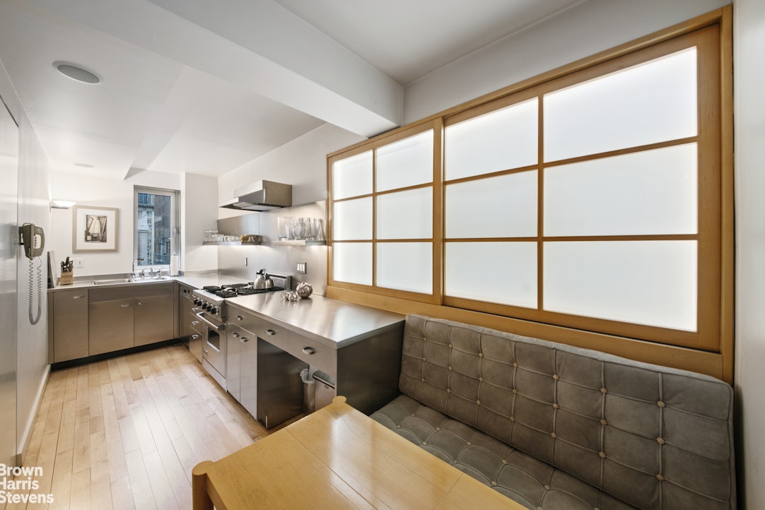 The stainless steel, windowed eat-in kitchen features top-of-the-line appliances and built-in banquette seating for four, perfect for casual dining. Off the generous central gallery, the primary suite offers a peaceful retreat, complete with a marble-clad en-suite bath, large windowed office or dressing area, and an enormous cedar-lined walk-in closet. An adjacent custom-designed dressing room (or library) includes built-in closets, a dresser, and specialized storage for garments, shoes, and accessories.