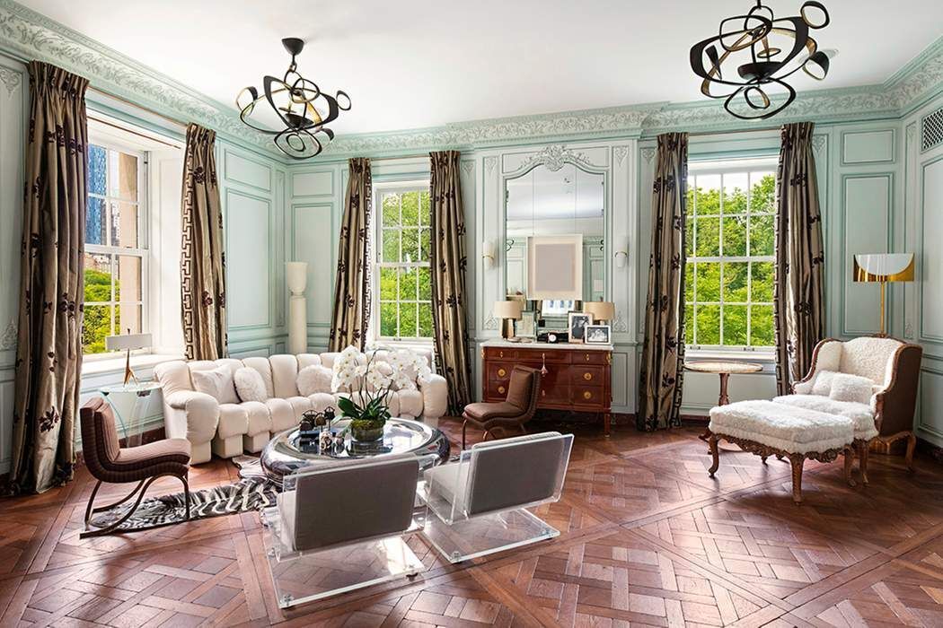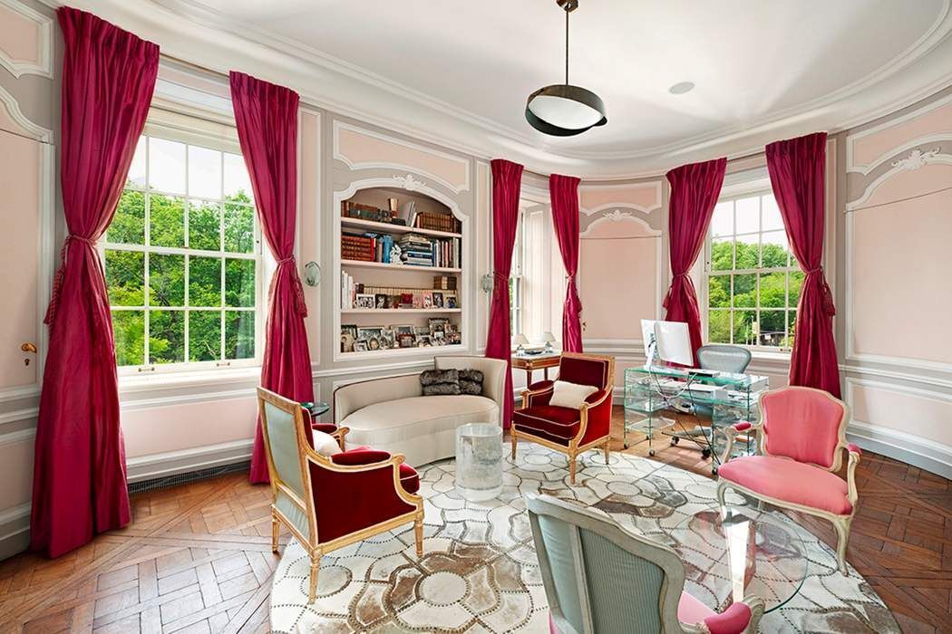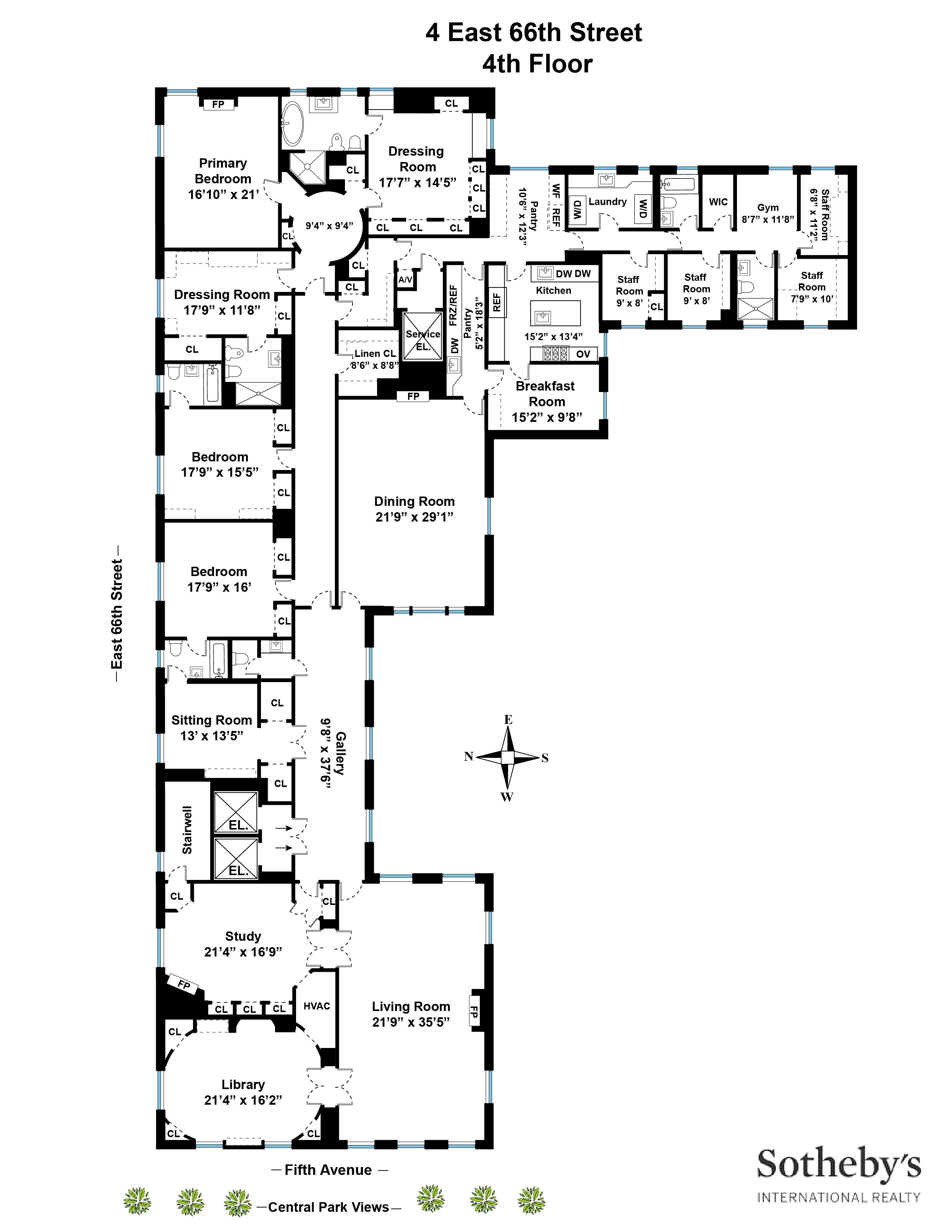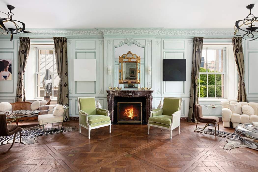 Accessed by private elevator landing, the impressive, south-facing Gallery is baronial in scale and opens to the very grand Living Room, over 35 feet in length and featuring a wood-burning fireplace and, most notably, exposures in three directions: east, south, and west towards Central Park. Adjacent, are a wonderful oval Library sharing the same views of Central Park and wrapping the northern corner, and a stylish octagonal Study with a wood-burning Fireplace. These rooms delight in their scale and sublime proportions. At the opposite end of the Gallery, a monumental Dining Room also has a wood burning fireplace and exquisite architectural detail, including a carved plaster ceiling. Indeed, throughout these extremely impressive entertainment rooms, there is gorgeous detail, beautiful paneling and carved plaster moldings, as well as parquet de Versailles floors.