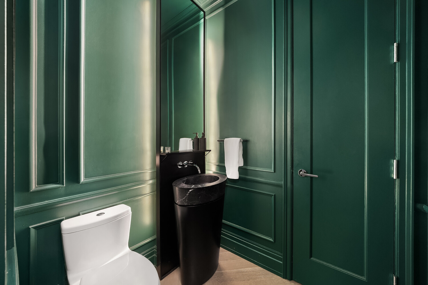 The primary suite offers generous natural light and a serene en suite bath clad in high honed Calacatta Mandria marble. A custom double vanity, Fantini polished chrome fixtures and an oversized walk in shower elevate the experience. All closets in the residence have been custom built by California Closets, adding a high level of organization throughout. The powder room is equally striking, centered on a Nero Marquina marble sink and black metal mirror with integrated lighting, and includes an additional full height closet that increases overall storage capacity.
