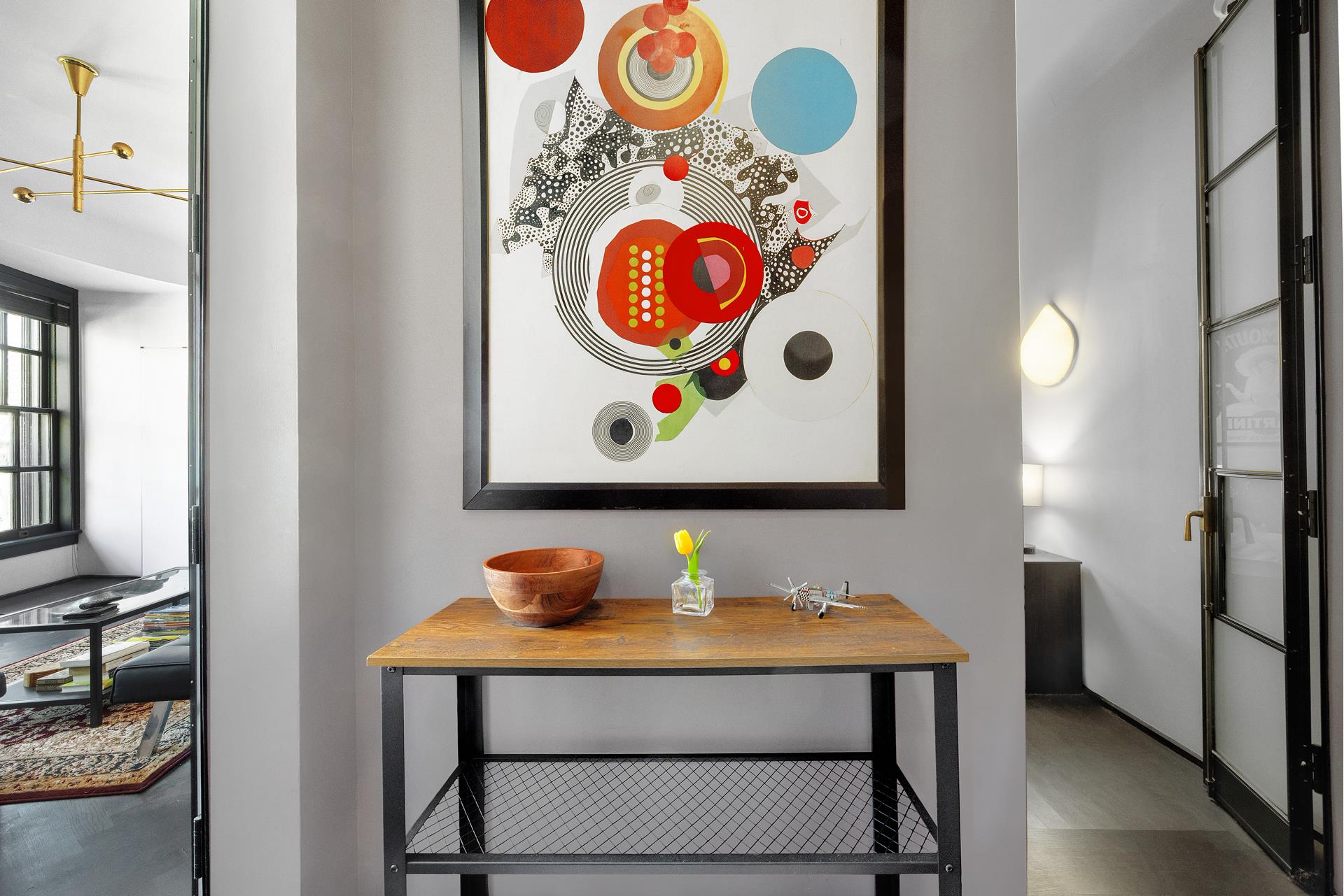 The peaceful bedroom has gorgeous Roll and Hill sconces and big south-facing windows. The sleek eat-in kitchen has a built-in banquet offering seating for four, custom cabinets, Waterworks fixtures, lovely tiles, a two-burner stove, and fridge and freezer drawers.