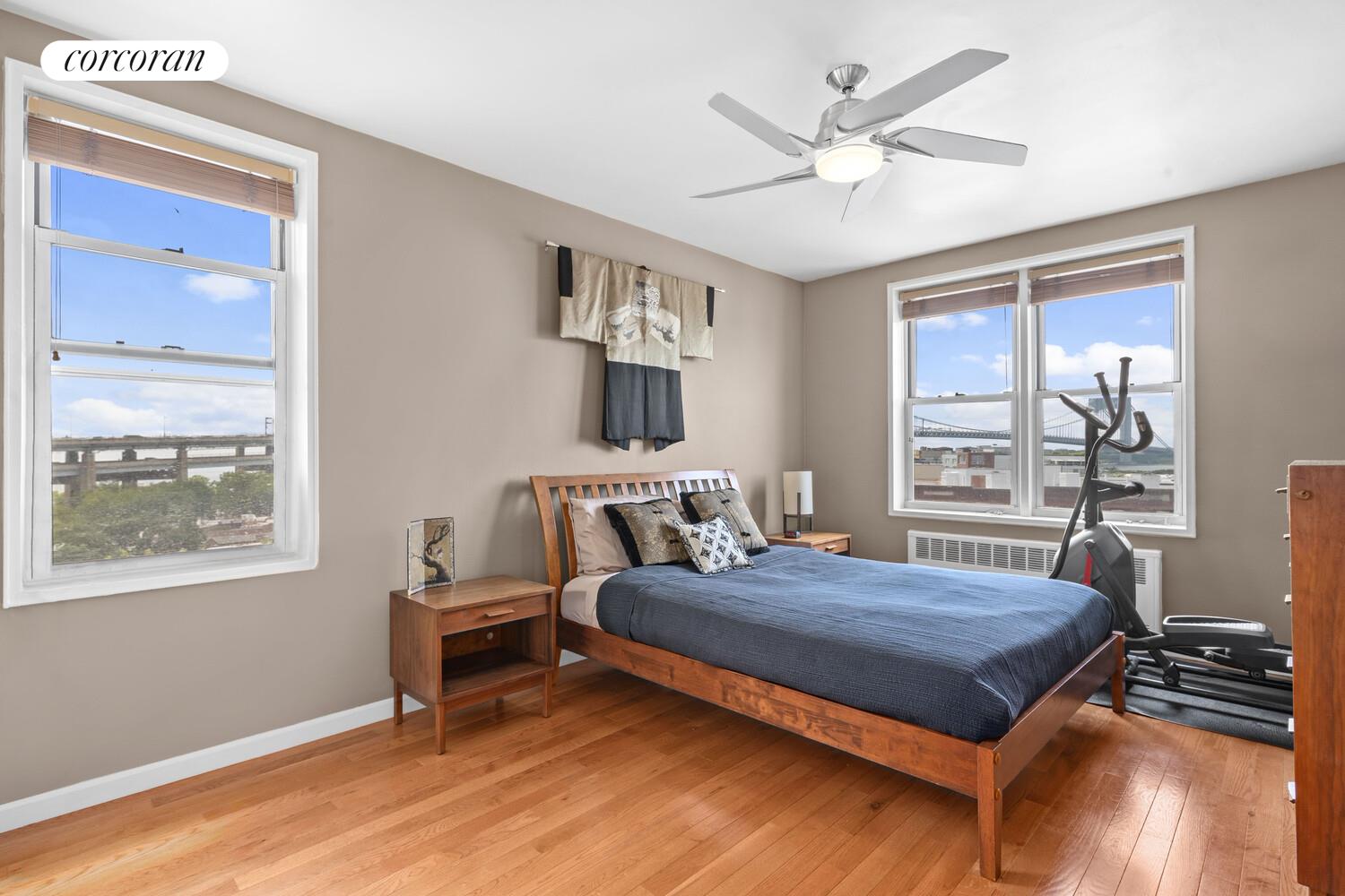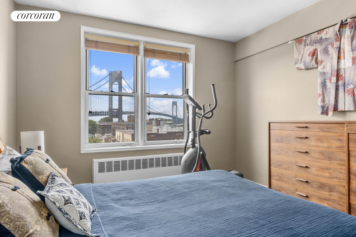 The king-sized bedroom offers a peaceful retreat, complete with two exposures and jaw-dropping views of the Verrazano Bridge, where you can enjoy the morning sunrises or evening cityscapes. The updated bathroom continues the home's modern aesthetic with clean finishes and spa-like comfort.