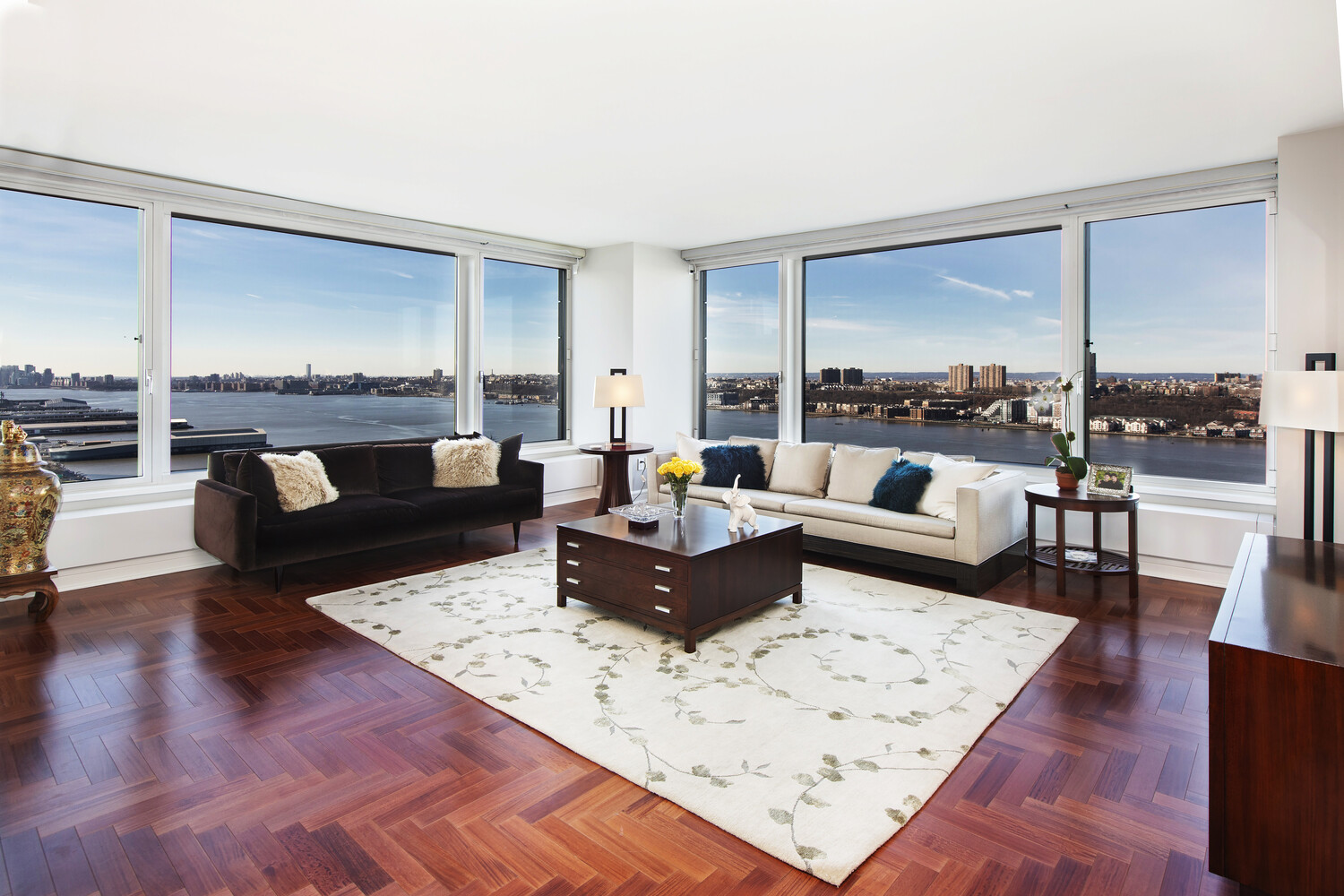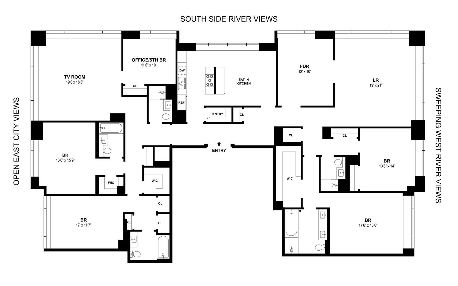 From the instant you step off the elevator into the semi-private landing and then into the marble entry foyer, you will be wowed by the grand corner living room with its huge windows that offer sweeping city and river views. The formal dining room faces south as does the fabulous eat-in-kitchen with its breakfast bar, granite countertops, and stainless-steel appliances. This seamless combination has two river facing bedrooms including the primary with its en-suite bathroom that offers a glass enclosed steam shower, double sinks and soaking tub and tremendous walk-in closet. There are an additional three or four more spacious bedrooms plus a den.