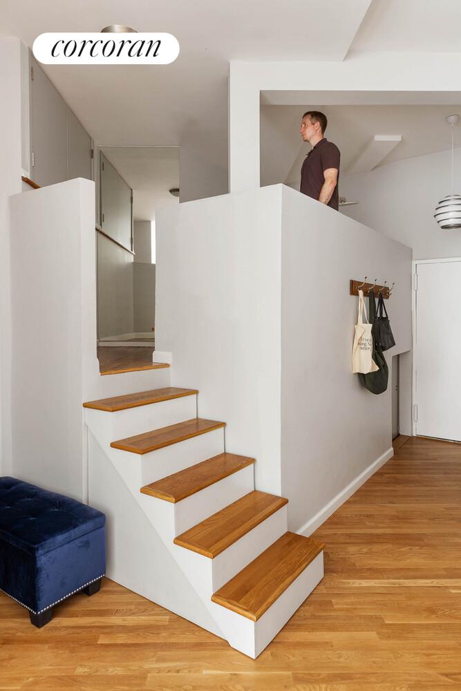 Up five steps, the lofted sleeping area offers nearly 7-foot ceiling height and comfortably fits a queen-size bed with space for a TV. Smart built-ins and hidden storage make the space both practical and cozy.