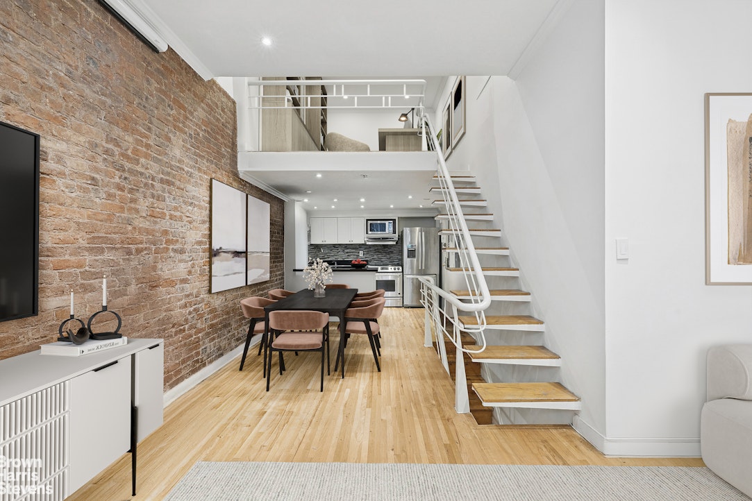 The residence itself is a unique loft-style triplex showcasing exposed brick walls, a dramatic oversized casement window, and soaring 9'4" ceilings that fill the main living area with light and character. The renovated open kitchen features a breakfast bar and dining area, creating a seamless flow for both everyday living and entertaining.  The lower level includes a bedroom suite with a full bathroom, custom closet, and washer/dryer. The upper level offers a versatile loft space-ideal as a guest room, home office, or den-complete with its own full bathroom, large closet, and direct elevator access to the second floor.  Additional highlights include three split-system A/C units, a video intercom system, and pied-à-terre ownership permitted. (Please note: dogs are not allowed.)