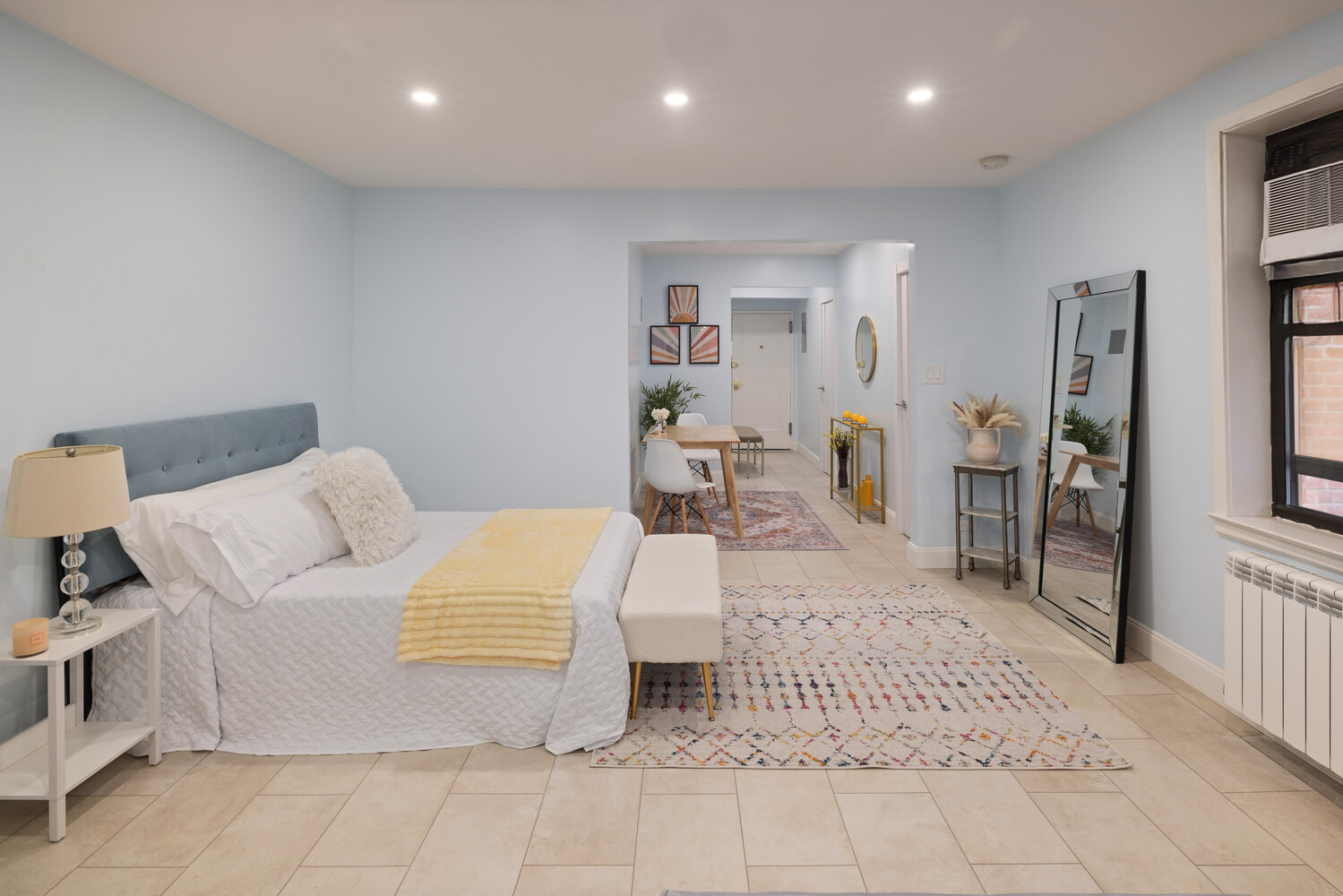 Brand New Renovated Corner Jumbo Studio with low monthly charges can be easily converted to a junior one bedroom. Meticulously renovated and efficiently designed floorplan that provides you the separation of space allowing you to design and tailor the areas you want in your new home, There are six oversized windows that surround the entire apartment giving the space an open and airy feeling and letting in abundant light streaming in throughout the day. A proper entry foyer leads one into the dining area that comfortably seats parties of four or even more. There is a private home office that allows meetings without disruption, away from the large open main space. A well-proportioned living room can be sectioned off to entertain while preparing wonderful meals before moving into the dining room.Streamlined and refined, a brand-new kitchen has white porcelain tiled back splash with complimentary white shaker cabinets to the ceiling, under cabinet lighting, and marble countertops spanning across the kitchen giving you a lot of room for meal preparation. There is a generous double-height storage pantry. Brand-new high-end appliances, built-in microwave, five burner stovetop with grill & oven, two door refrigerator with a double freezer and a whisper quiet Bosch dishwasher complete this exquisite kitchen. The sleeping alcove can accommodate either a queen or a king size bed with some furniture, and can be partitioned into a more private double windowed bedroom with a barn door for entry - choose what works best for you! indowed sleek bathroom has new fixtures, a Toto toilet and modern porcelain tiles throughout. Skim coated walls, tiled flooring, new light fixtures include ceiling fans, modern slim line radiators & a new built in window air conditioner at the top of the window. There is a huge customized walk-in closet in addition to an entry foyer closet .This move-in ready apartment is a great starter apartment as your primary residence or a perfect pied-a-terre.