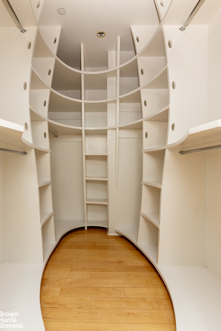 The king-sized master bedroom suite features more impressive custom work, including a stunning, one-of-a-kind walk-in closet (its organic curves were built to climb in order to reach the highest compartments) and an en-suite master bathroom, boasting marble counter tops, separate shower and soaking tub. The second bedroom, where two children were raised, is also quite large with a 10' foot window and its own en-suite bathroom. There is a powder room for guests, a large laundry room with pantry, AV systems, and central air with two zones for the apartment.